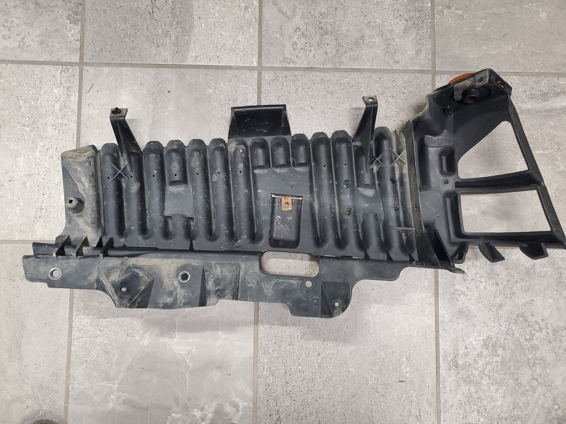 This front right fender flare support is in good overall condition. It has a crack on the front-facing side (see last picture), but the part that bolts to the vehicle is good, so it can be reused.